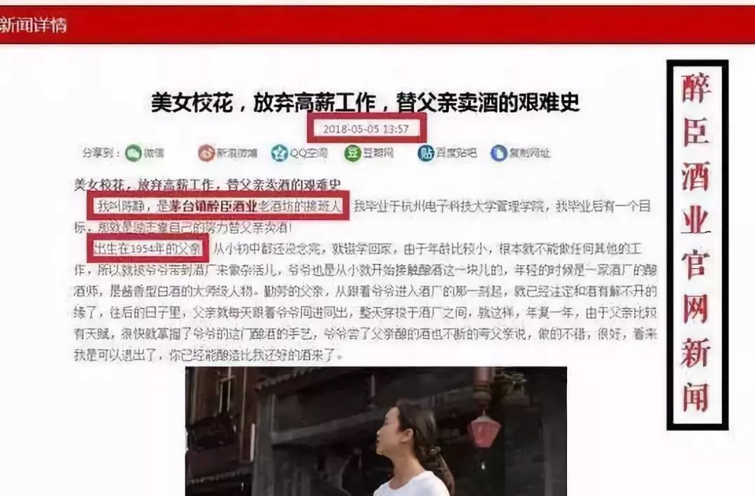 故事的主人公通常是青春靓丽的女大学生,放弃高薪或者城市生活,回到贵州茅台镇老家帮助父亲卖酒。这些推文的主角大多是“陈静”,还配上“父女”在车间、库房、高粱地的合照。由于版本不同,“陈静”的年龄也出现混乱,连“父亲”也由多人扮演。细心地网友会发现,关于这个内容,在不同平台上、不同时间发布的推文,P图痕迹严重,“陈静”不仅年龄混乱,连她的“父亲”也由多人扮演,甚至每个平台上出现的都是不同的“父亲”。其实,这是某酒业公司委托一家科技公司在各大网络平台上发布的广告推文。该广告推文,是为了销售一款贴牌生产的白酒。