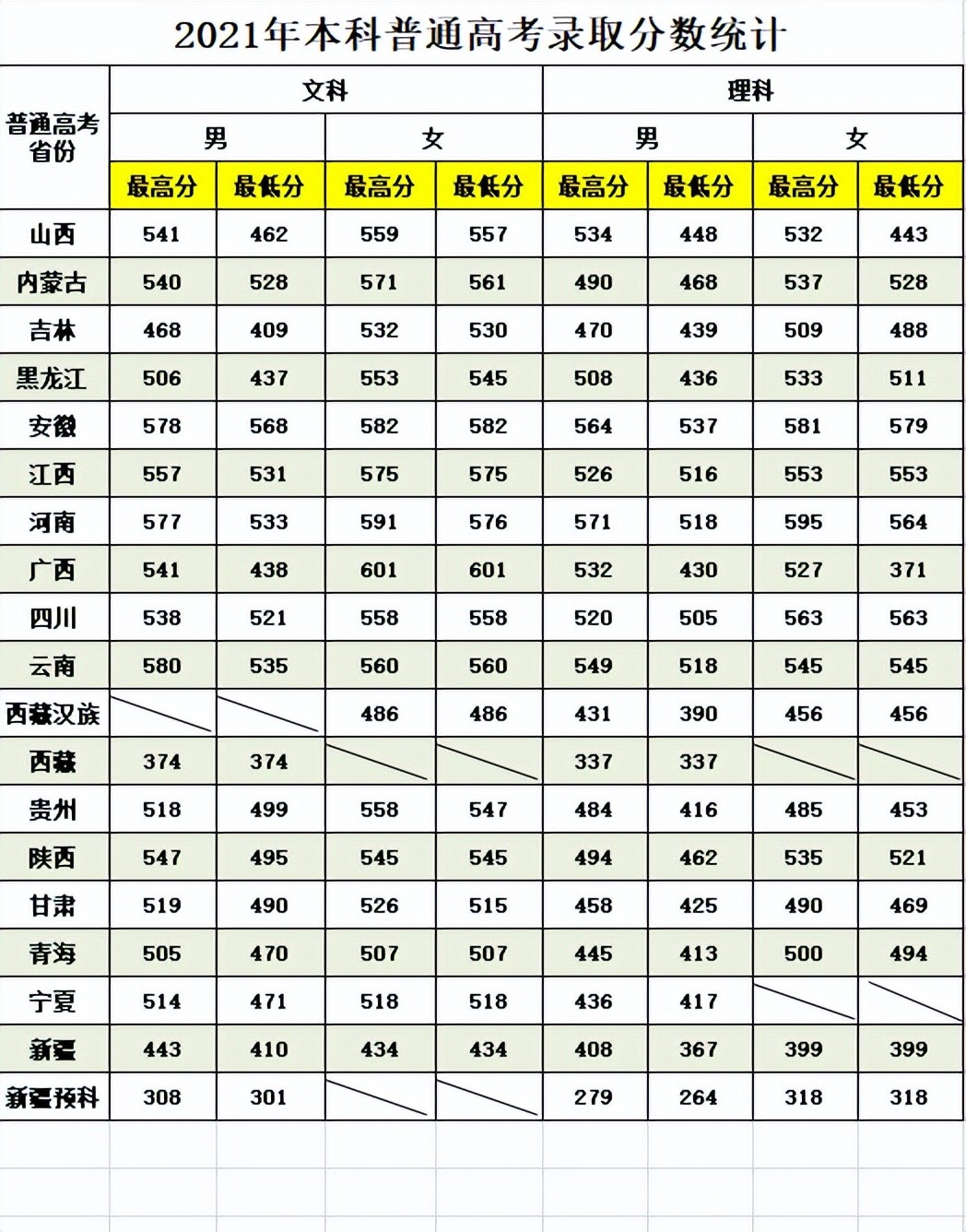 理科(女生)新疆的录取分数线最低,录取最低分为318分。安徽省的录取分数线最高,录取最低分为579分;(男生)新疆预科的录取分数线最低,录取最低分为264分。安徽省的录取分数线最高,录取最低分为537分。