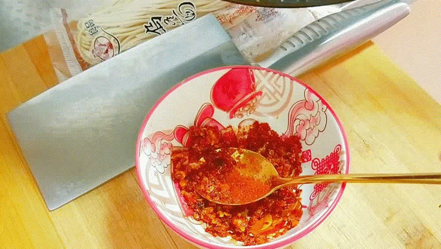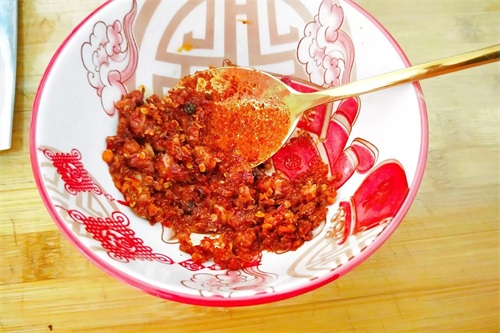 2:)一瓣蒜去皮切碎,放入小碗中,分别加入粗、细辣椒面各一小勺,再加入适量的盐和花椒油(我女儿自制的,当然也可以买成品,也可以用花椒粉)拌匀。