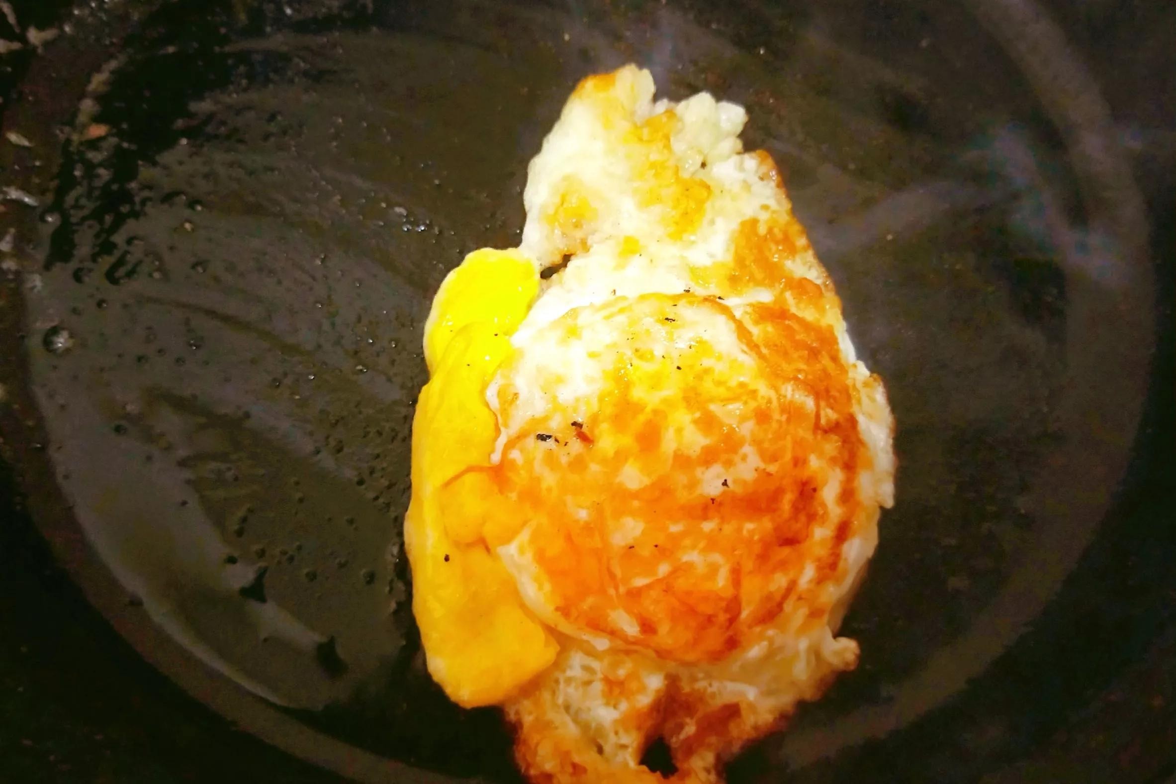 4:)再起锅烧油,油少许,加入少许盐,用锅铲划开油和盐,打入一个鸡蛋,煎至一面金黄,再翻面煎熟,即可铲出备用。