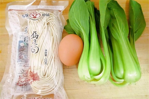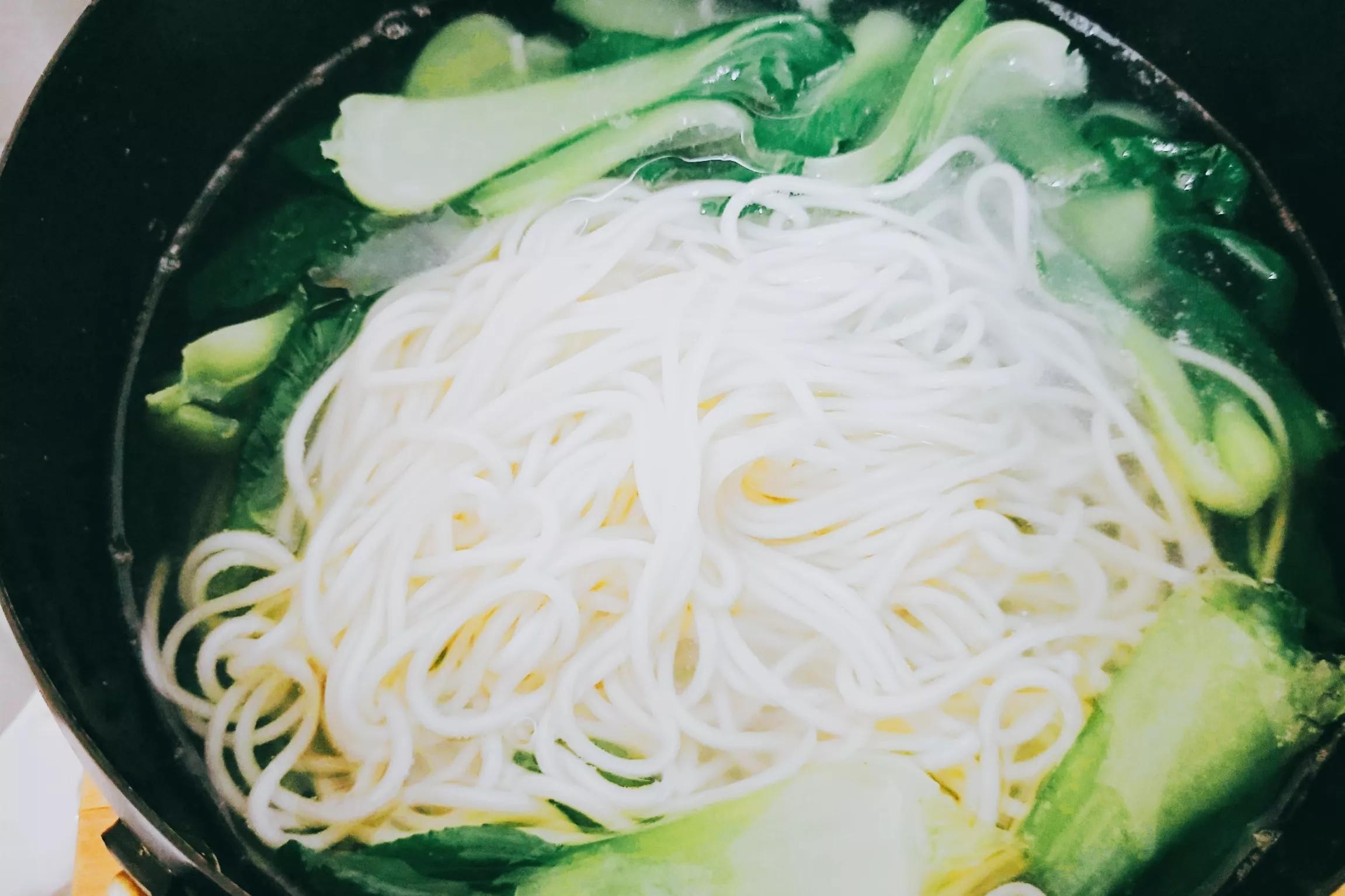 8:)煮至面熟时,把上海青放入面锅中煮熟,即可关火。