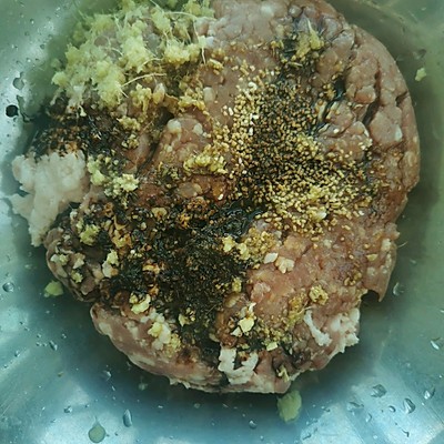 2、肉馅中加入生姜碎,我加了有一两左右的生姜碎,加入生抽两圈,老抽一圈,一勺鸡精,根据自己口味加入盐调味。