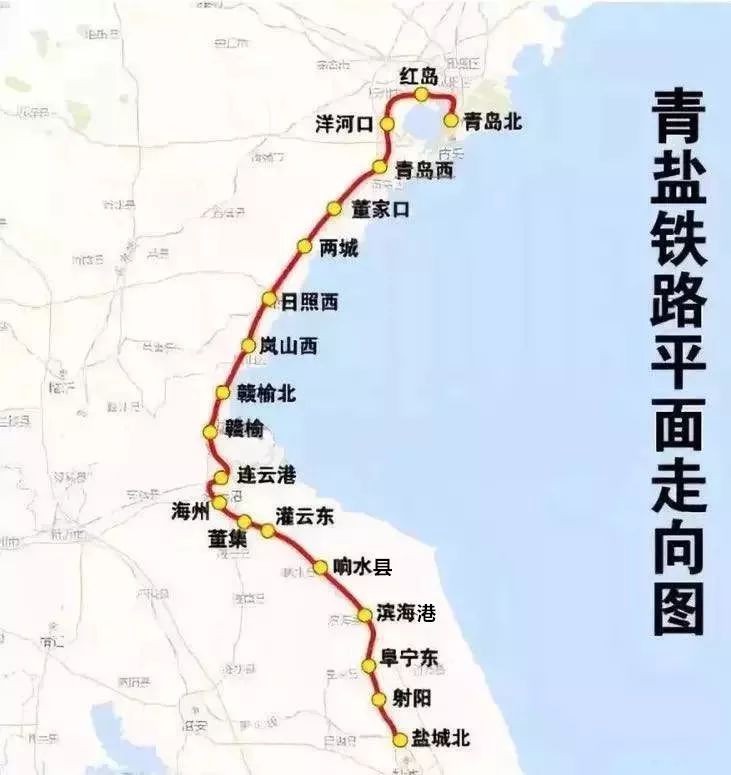 自青岛北站引出,经日照、连云港至盐城北站,线路全长428公里,全线设青岛北、红岛、洋河口、青岛西、董家口、两城、日照西、岚山西、赣榆北、赣榆、连云港、响水县、滨海港、阜宁东、射阳、盐城北16座办理客运业务的车站,运营时速200公里。