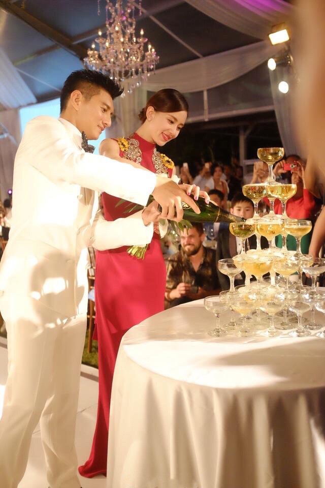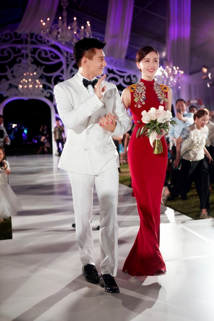婚礼晚宴在露天举行,现场浪漫梦幻,以紫色为主题,刘诗诗一身红色亚历山大麦昆修身礼服,而新郎则是一身白色西装。