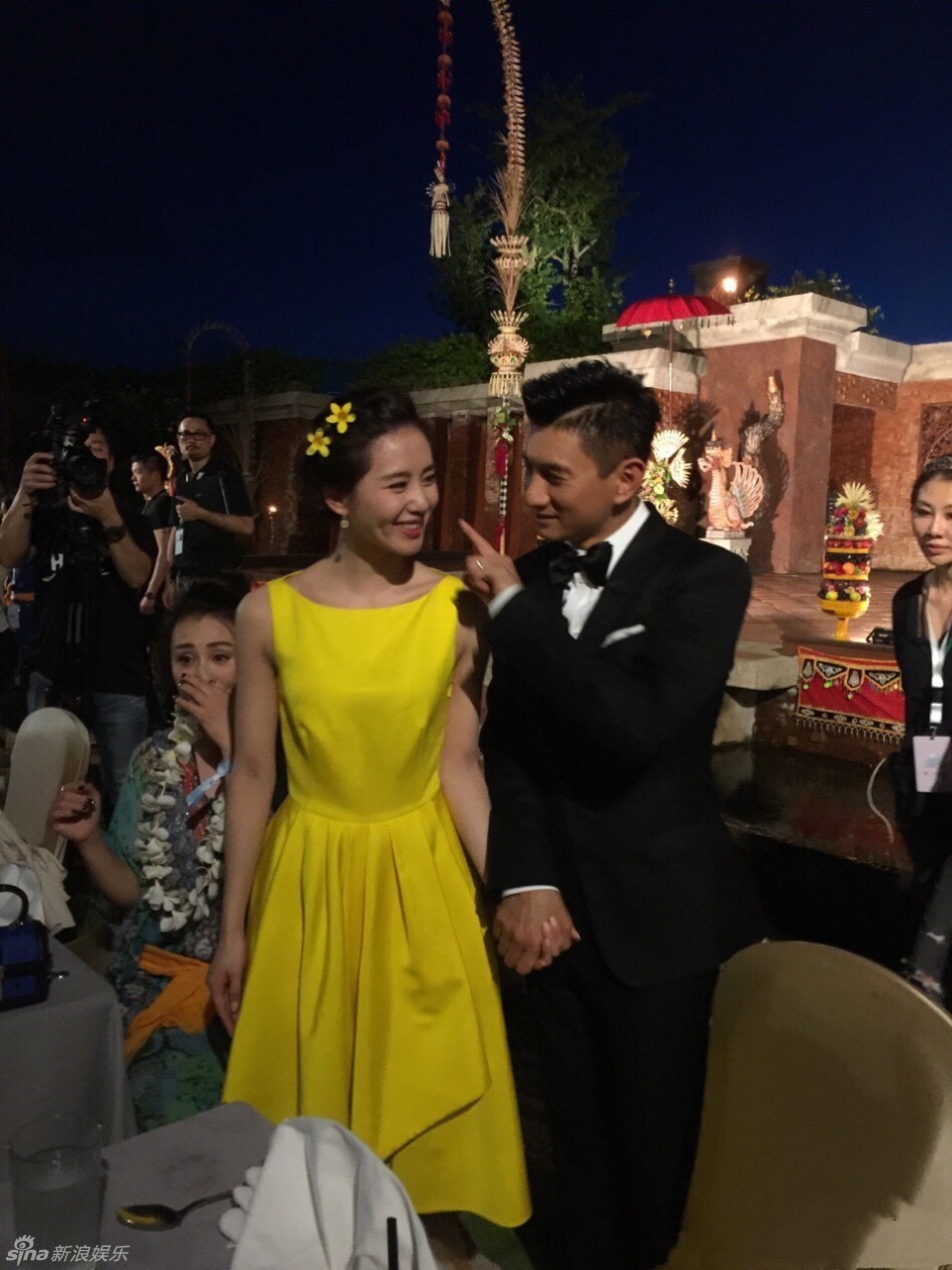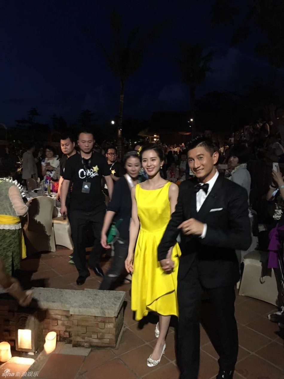 婚礼前一天婚前晚宴,刘诗诗穿了一件明黄色连衣裙,头上别了两朵黄色小花,整个人充满东南亚热带风情。刘诗诗一袭黄色连衣裙温柔娴静,微微一笑甜美动人,她与吴奇隆手拉手恩爱甜蜜艳羡众人。