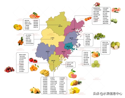据有关数据查询,福建的水果种植面积和产量都排名国内前十,那福建到底有特色水果呢?下图为福建的水果地图: