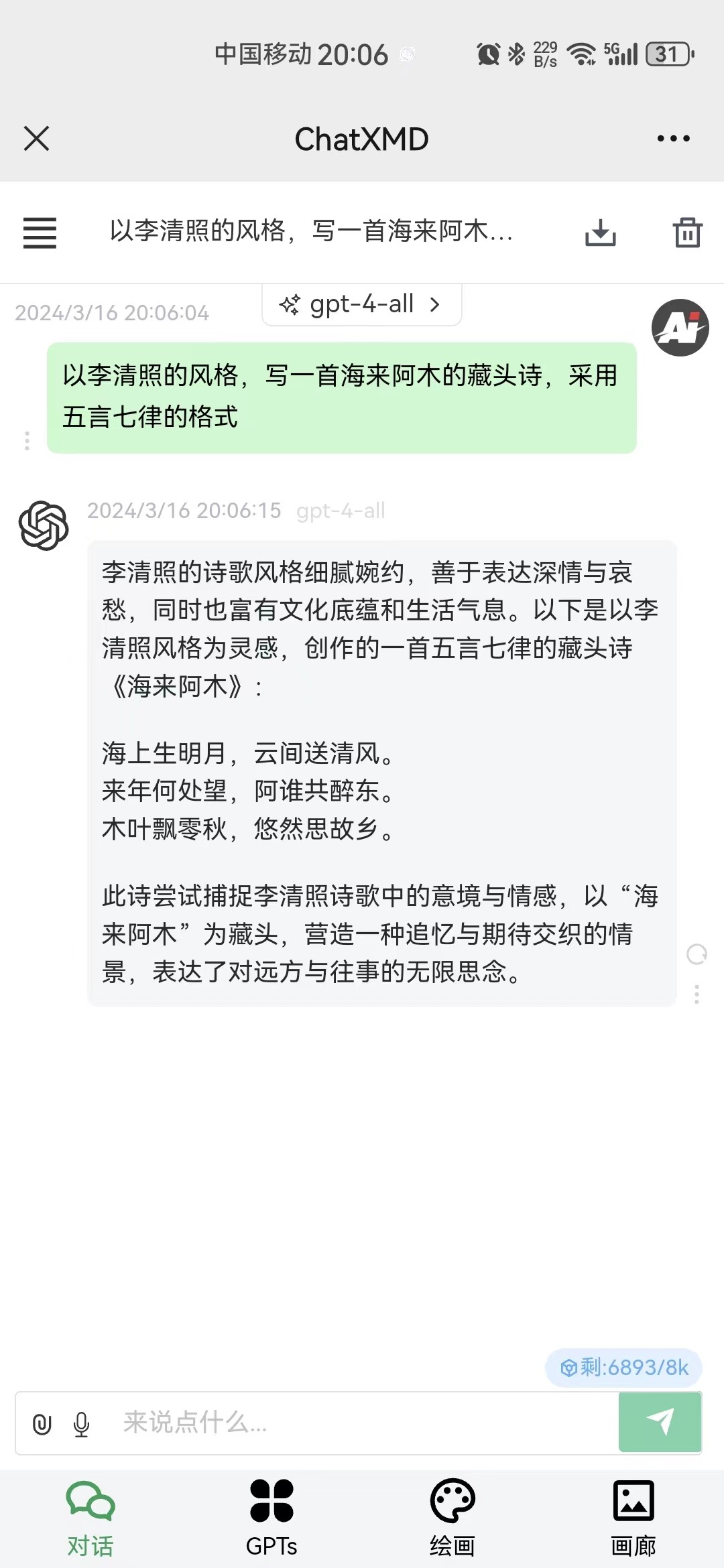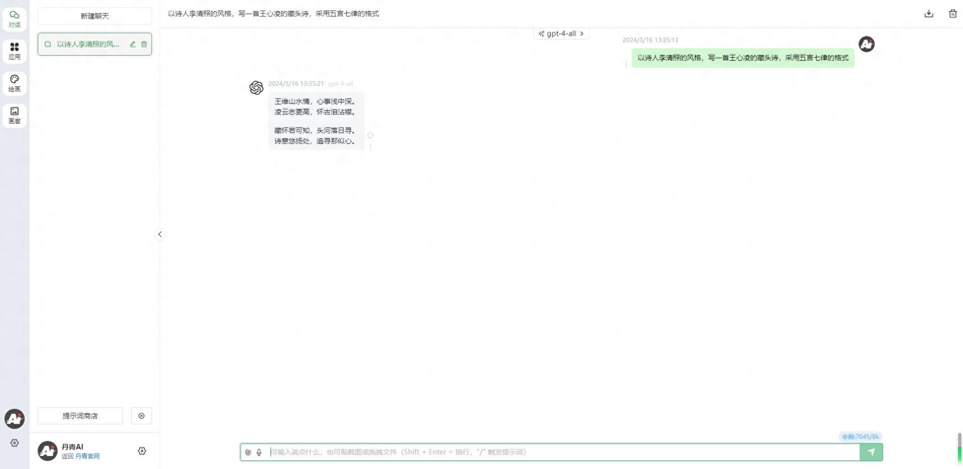 第五步:在弹出的输入框就可以描述藏头诗在线制作的需求了,比如输入“以李清照的风格,写一首海来阿木的藏头诗,采用五言七律的格式”,那么姓名藏头诗生成器就会自动写出如下图所示的在线藏头诗: