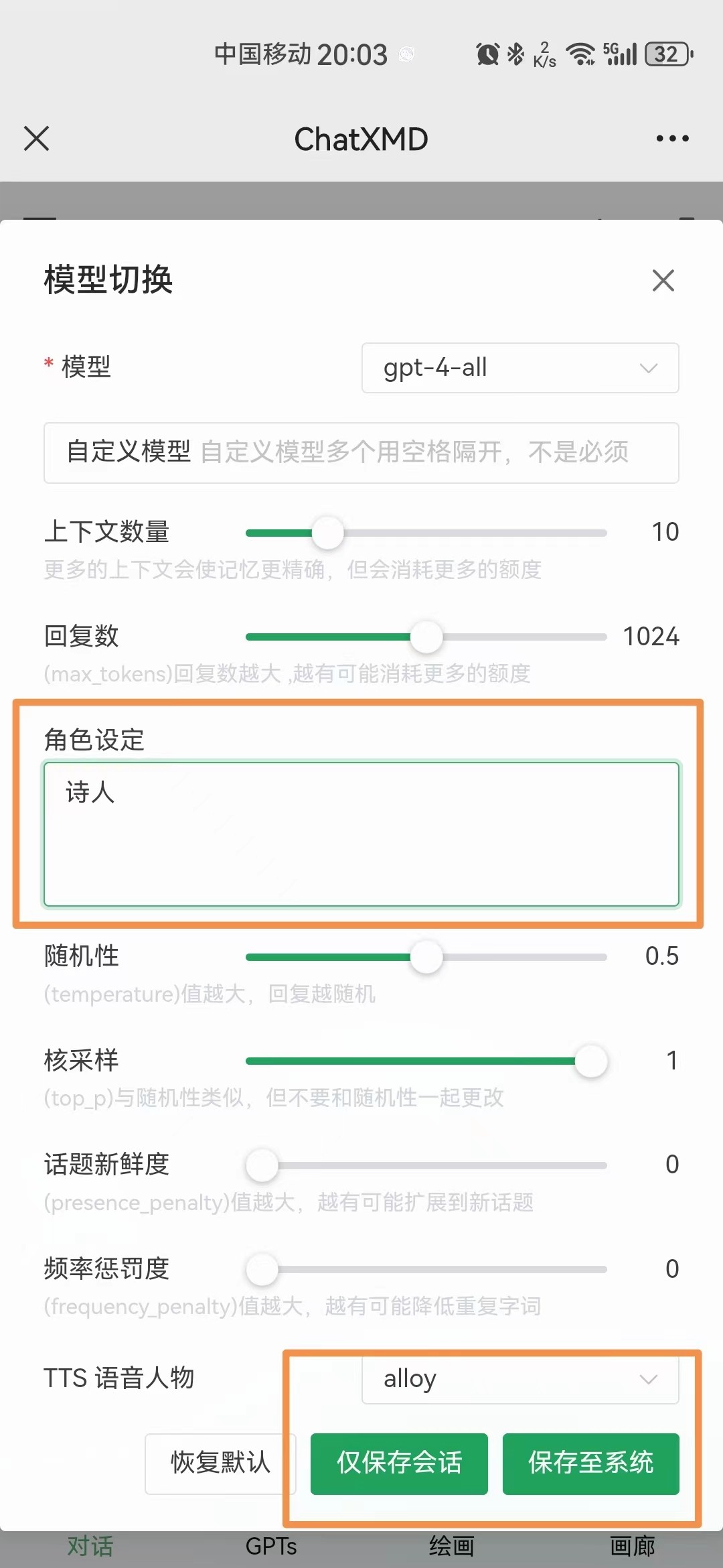 第四步:在“角色设定”位置填写比如“诗人”,如果你是需要写作其它东西,可以根据具体创作者角色进行设定;然后点击右下角的保存按钮;