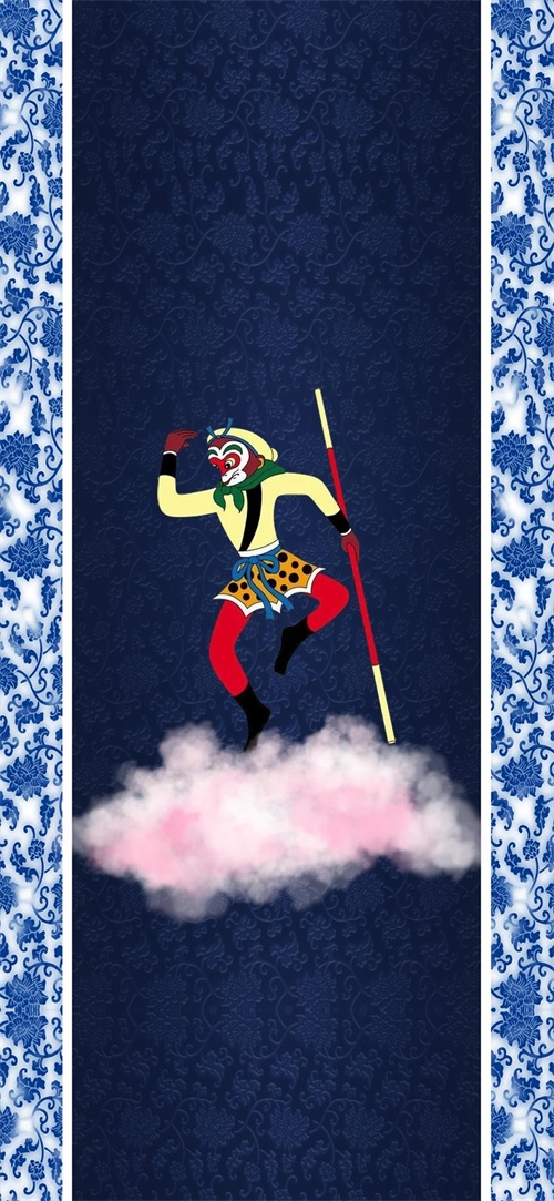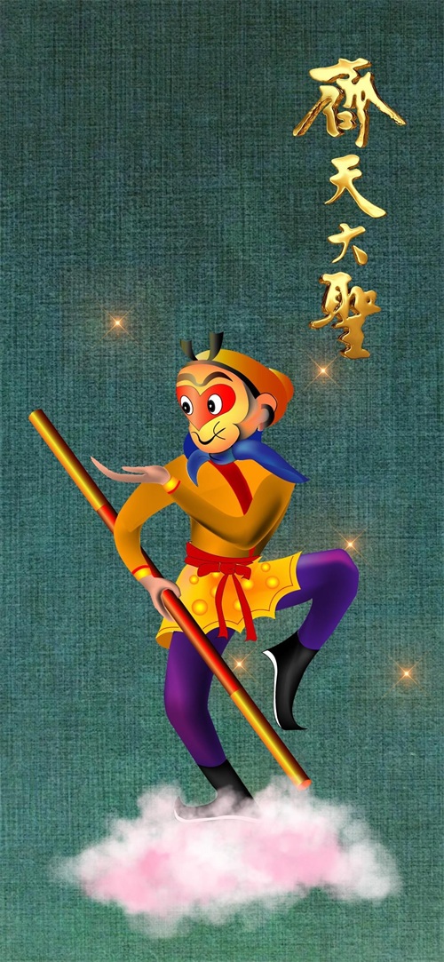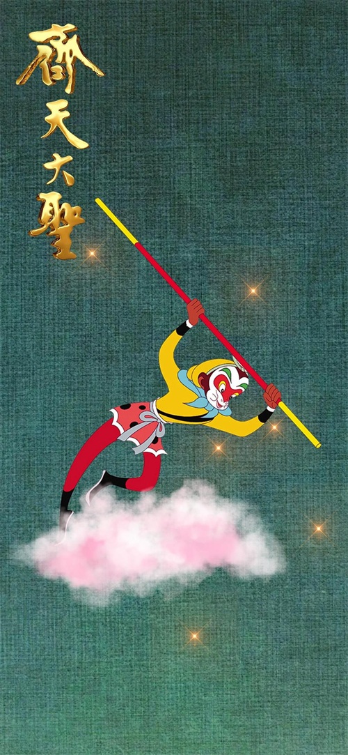 下面这张壁纸,背景是布纹,右上方我放置了“齐天大圣”金色图片文字元素,同时放置了星光元素。在悟空形象下方,我放置了祥云图片元素。这个悟空形象比较温馨。