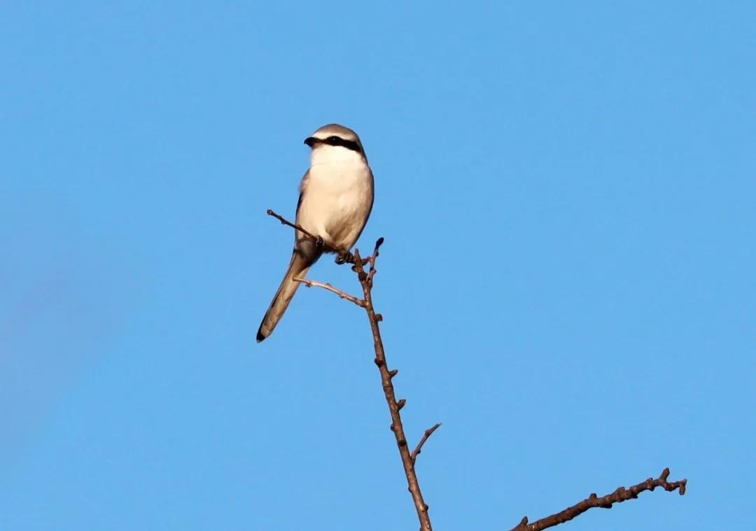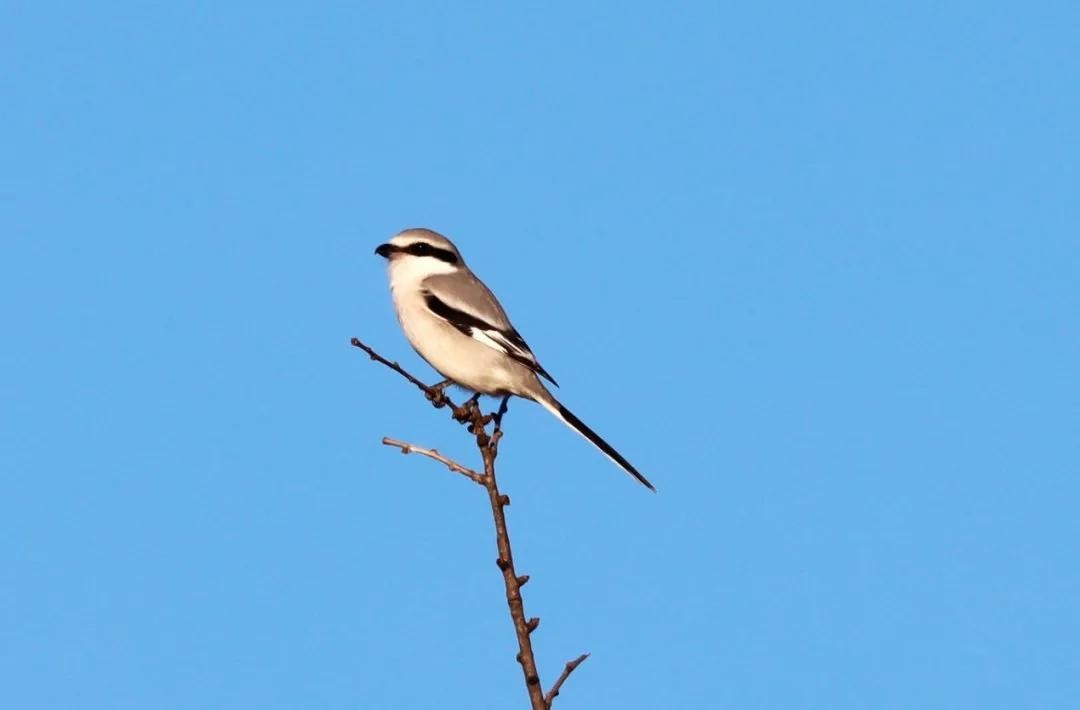 我们雌雄羽色相似,体长29-31 cm,在我国灰色伯劳中体型最大。虹膜暗色,嘴黑色,喙似猛禽,末端呈钩状,脚黑色。成鸟具典型的“黑眼罩”,前额及眉纹白色。头至背及尾上覆羽灰色,翼黑色具白斑块。下体白色。尾羽甚长,末端呈典型楔形,其中中央尾羽最长,呈黑色,向外尾羽渐短,呈白色。