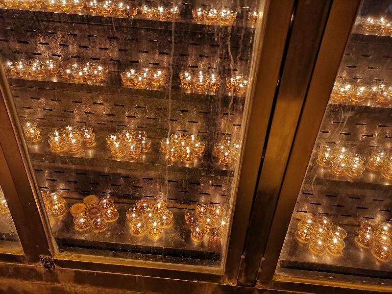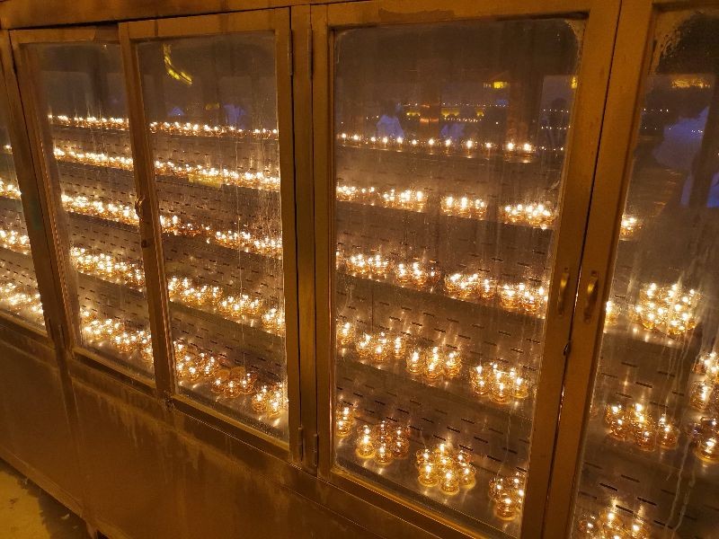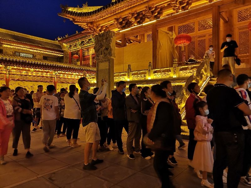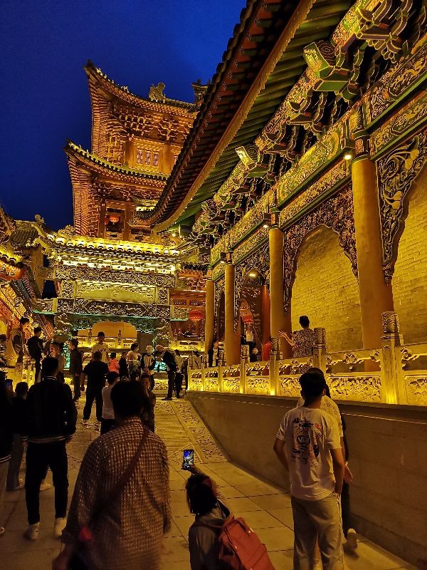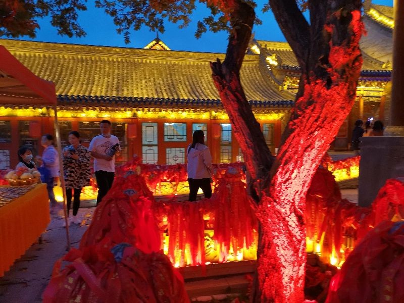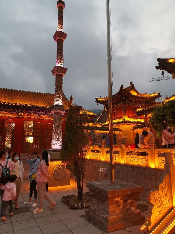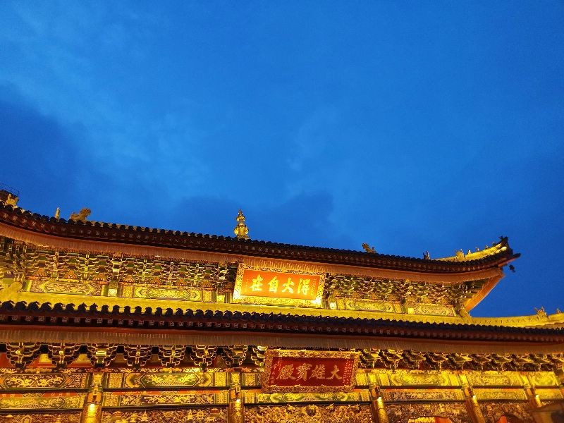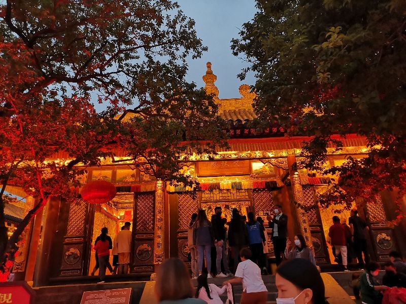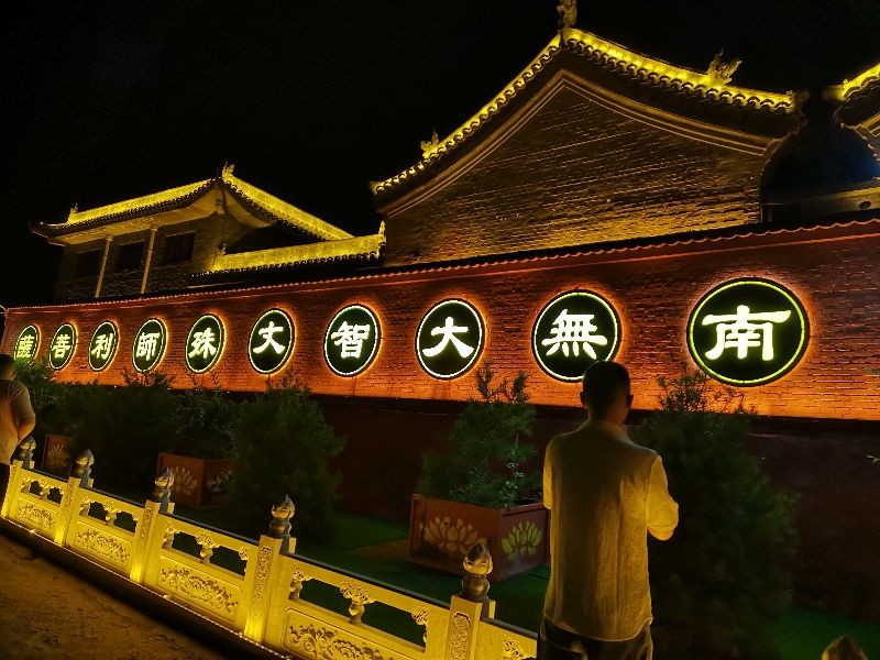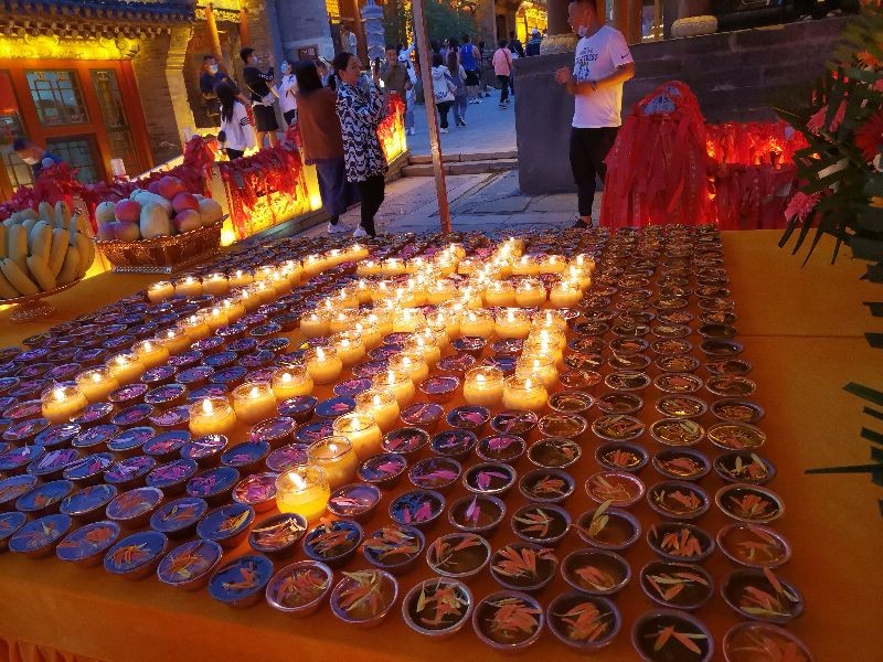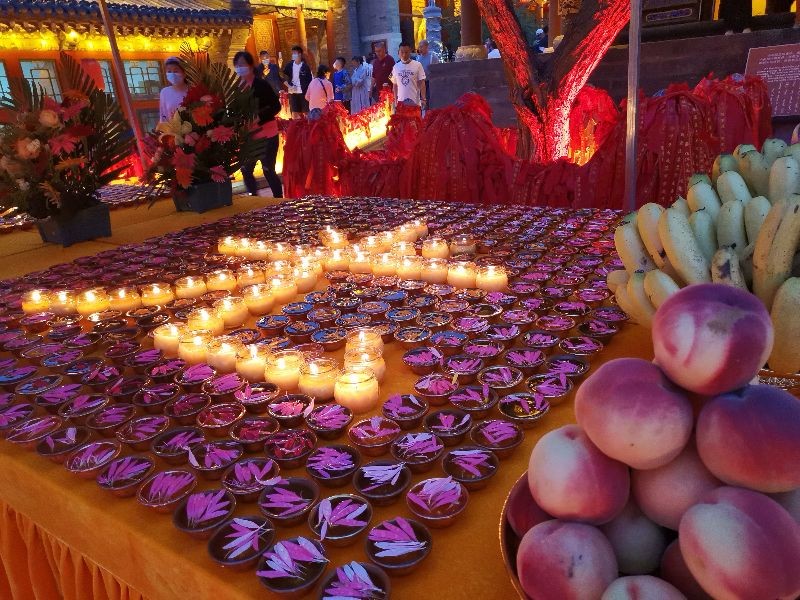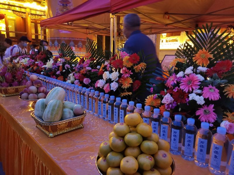 我当天去恰逢观音菩萨成道日阴历六月十九的晚上。寺院白天做了法会活动。灯光灼灼,摆成佛光普照四个灯字,燃烧发光。供灯台中五盏摆成一朵花形。夜色中火焰明亮跳跃。恭请菩萨的种种供花供果依然丰盛。广化寺特有的夜景灯带已然点亮。