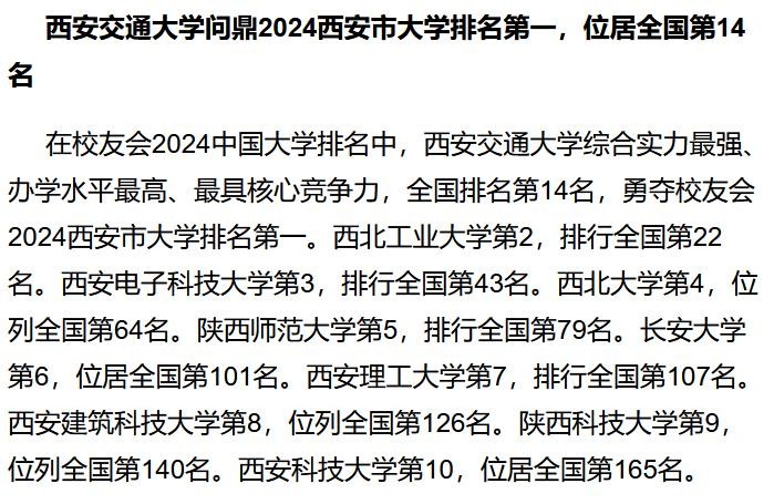 西安交通大学、西北工业大学、西安电子科技大学稳居校友会2024西安市大学排名前三强。