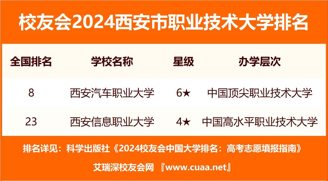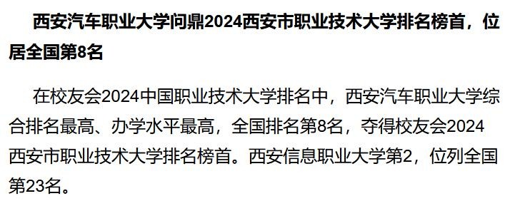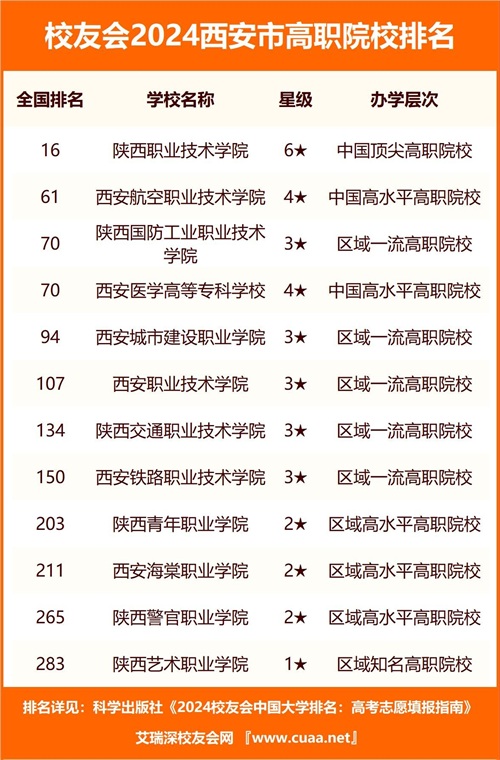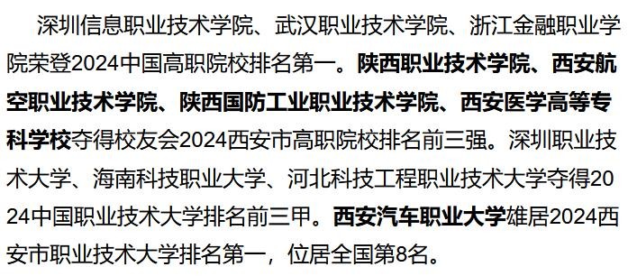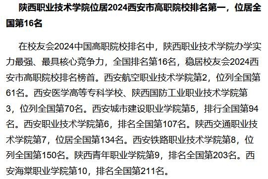 陕西职业技术学院、西安航空职业技术学院、陕西国防工业职业技术学院、西安医学高等专科学校夺得校友会2024西安市高职院校排名前三强。