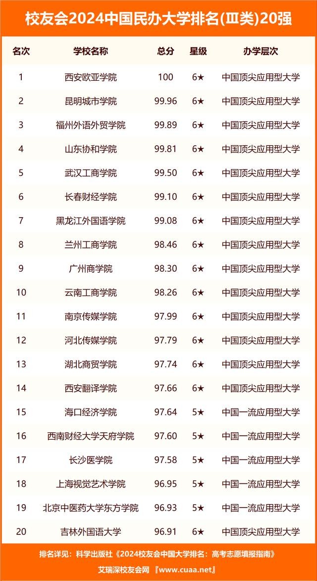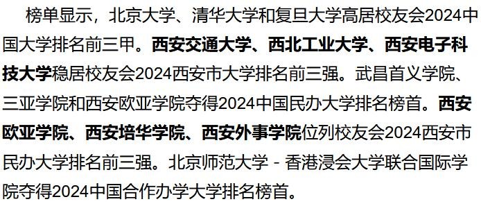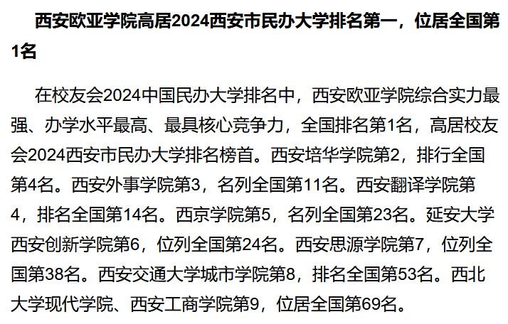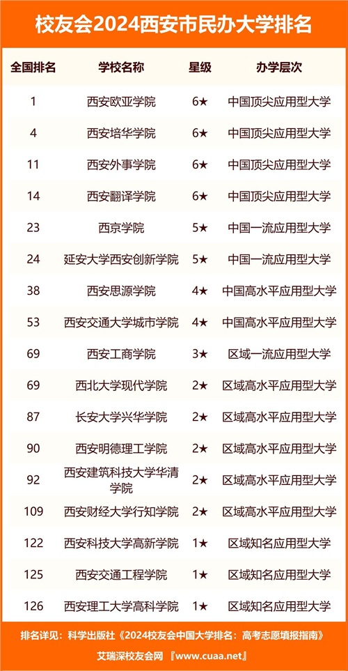 西安欧亚学院、西安培华学院、西安外事学院位列校友会2024西安市民办大学排名前三强。