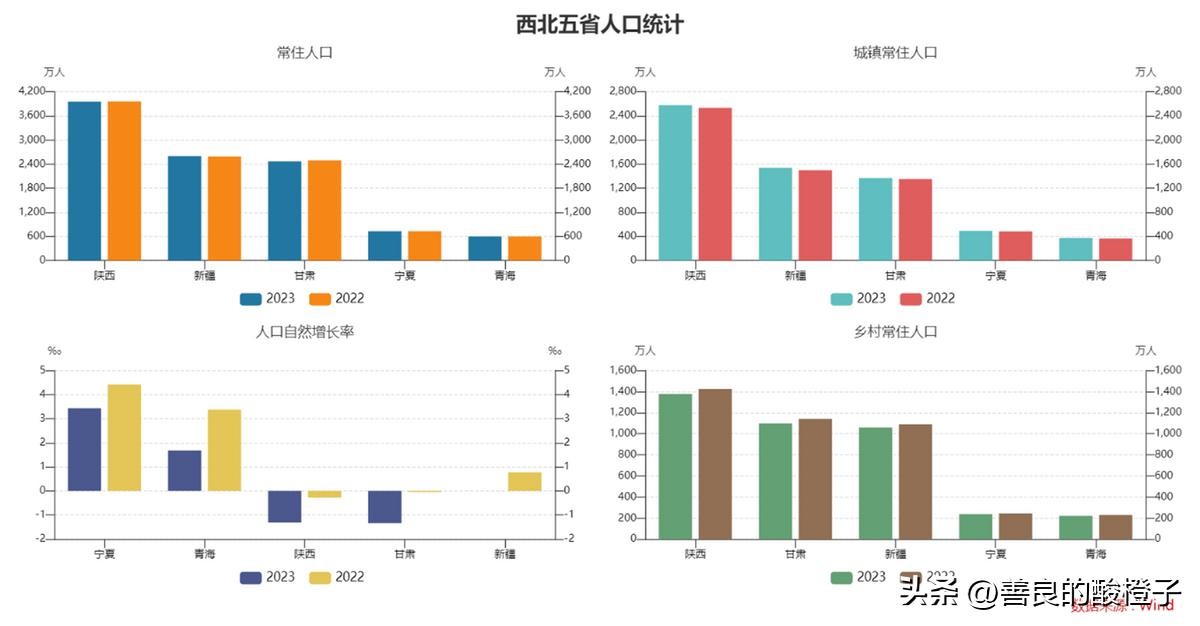 从人口情况看,常住人口最多的为陕西省,其余依次为新疆、甘肃、宁夏、青海,地广人稀用在青海省最恰当不过;城镇常住人口与常住人口分布基本相似。人口自然增长率方面,陕西、甘肃出现了负增长。农村人口方面,陕西、甘肃、新疆的农村人口均处于较高规模,宁夏、青海农村人口相对较少与它们的人口规模较低相关。