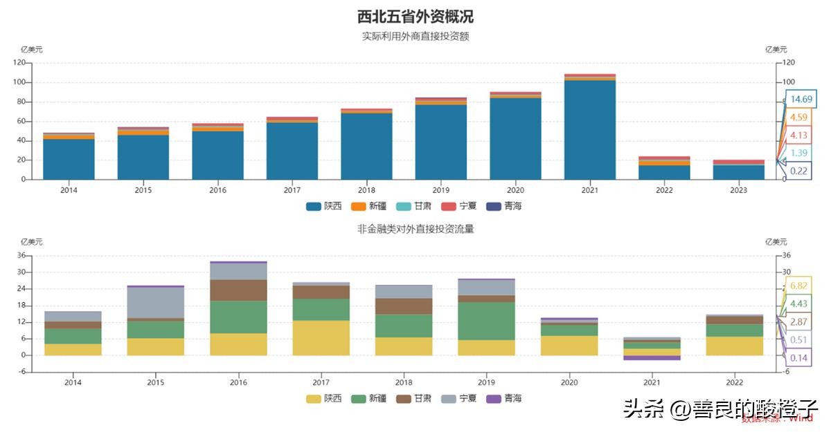 从实际利用外商直接投资额情况看,陕西达到14.69亿元,为利用外资最多省份;青海为0.22亿元,为利用外资最少省份。