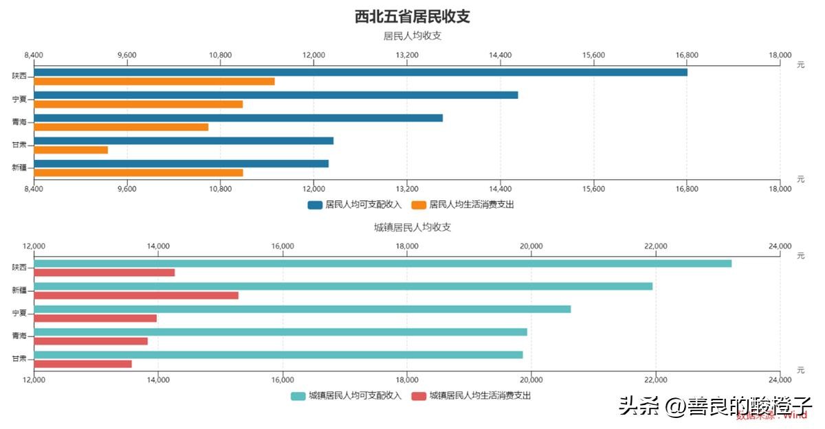 从居民收支情况看,居民人均可支配收入方面,陕西、宁夏、青海最好,当然青海因为地处高原,部分居民收入中有一部分补贴存在;居民人均生活消费支出方面,陕西最高,甘肃最少;城镇居民人均可支配收入方面,陕西、新疆最好,甘肃最差;城镇居民人均生活消费支出方面,新疆最高,甘肃最低。貌似甘肃人民的消费热情并不高涨。
