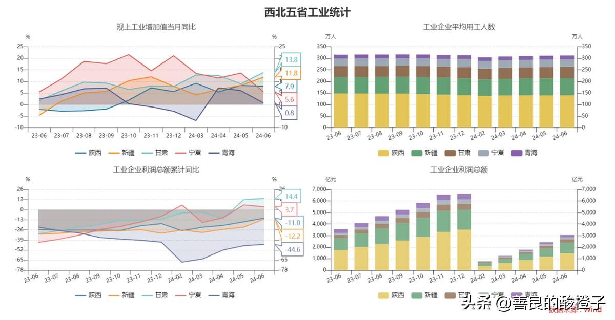从工业统计情况看,规模以上工业增加值当月同比方面,甘肃最大,青海最低,陕西基本居中;工业企业平均用工人数方面,陕西最多,青海最少,这与经济体量相关;工业企业利润总额方面,陕西最好,宁夏最差,其中宁夏、青海未超200亿元;工业企业利润总额累计同比方面,甘肃、宁夏为正,其余省份均为负。