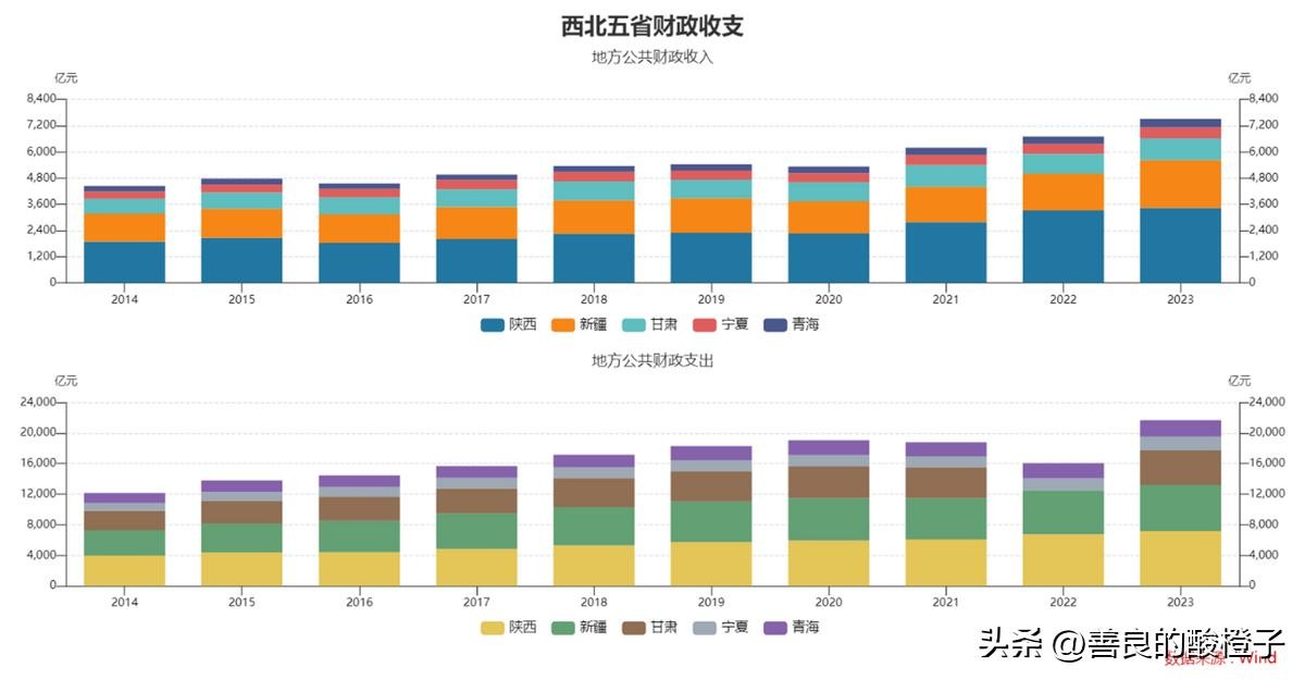 从地方公共财政收入看,青海、宁夏未破千亿,实力较弱;陕西省永远是老大哥,突破3千亿。从地方公共财政支出,陕西省支出最多,破7千亿;青海、宁夏收入不多但花钱能力不错,当然还是转移支付的支撑,支出分别为2188亿元、1751亿元。