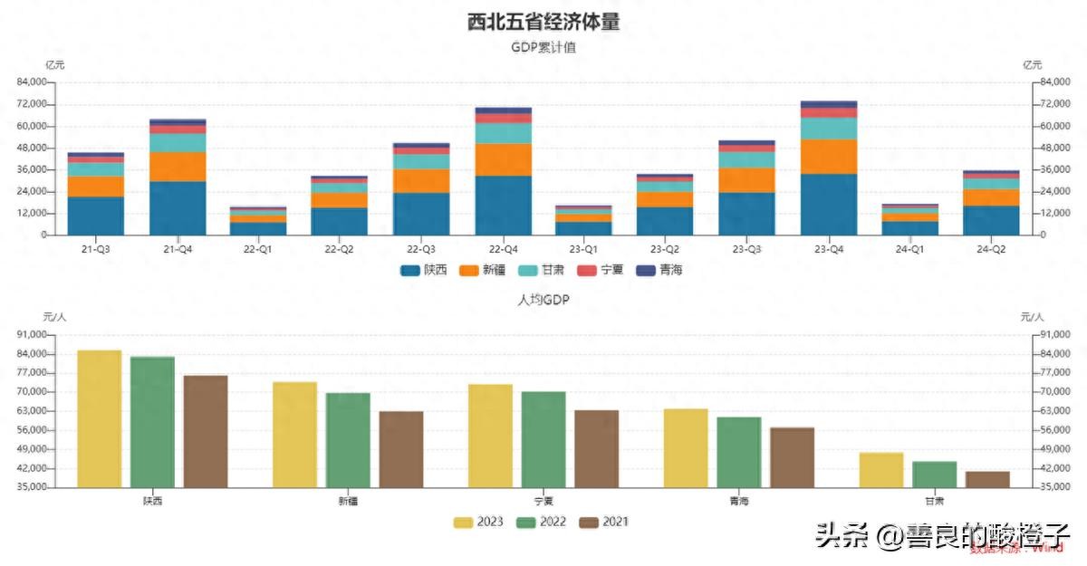 从经济总量上看,GDP规模最强的为陕西,最弱为青海省。人均GDP方面,最强为陕西,最弱为甘肃。