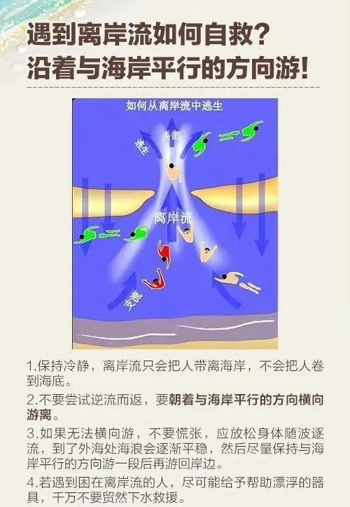 第二,避免逆流而行。离岸流的力量远超我们的预想,试图逆流向岸游回,往往会消耗我们的体力却换来微乎其微的进步。所以,如果发现自己被离岸流卷入,千万不要直接向海岸游去。