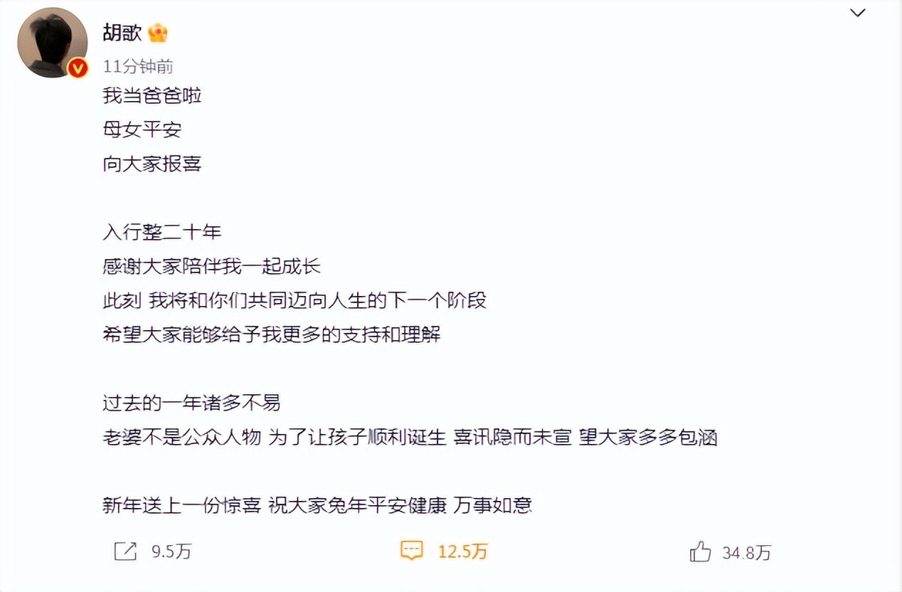 一直都没有绯闻传出的胡歌原来早已结婚,并且在今天官宣了孩子已经诞生,母女平安,她在社交平台上配文称:“我当爸爸啦!母女平安,向大家报喜。”他还表示,在入行的这20年里感谢大家的陪伴,此刻他将进入人生的下一个阶段,也希望大家能够给予我更多的支持和理解。