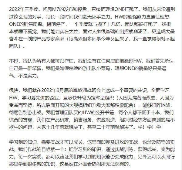 【CNMO 新闻】日前,理想汽车 CEO 李想在微博发长文,自述理想汽车 " 成长史 "。李想透露,2022 年三季度问界 M7 的发布和操盘,直接把理想 ONE 打残了," 从来没遇到过这么强的对手,很长一段时间毫无还手之力 "。很快,理想便决定全面学习华为,学习最先进的企业。