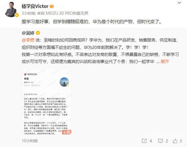 对此,浙江吉利控股集团高级副总裁杨学良评价称:爱学习是好事,但学到精髓挺难的,华为是个时代的产物,但时代变了。