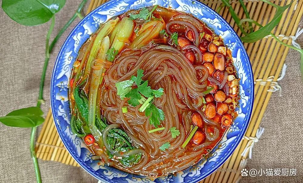 在锅中加入清水烧开,放入豆腐丝、黄豆芽和青菜焯水后捞起备用。接下来,将煮熟的宽粉或刀削面放入碗中。然后,在另一个锅中倒入清水,加入酱油、盐、花椒粉、味精等调料煮开成清汤,最后淋入辣椒油和香醋调成汤底。