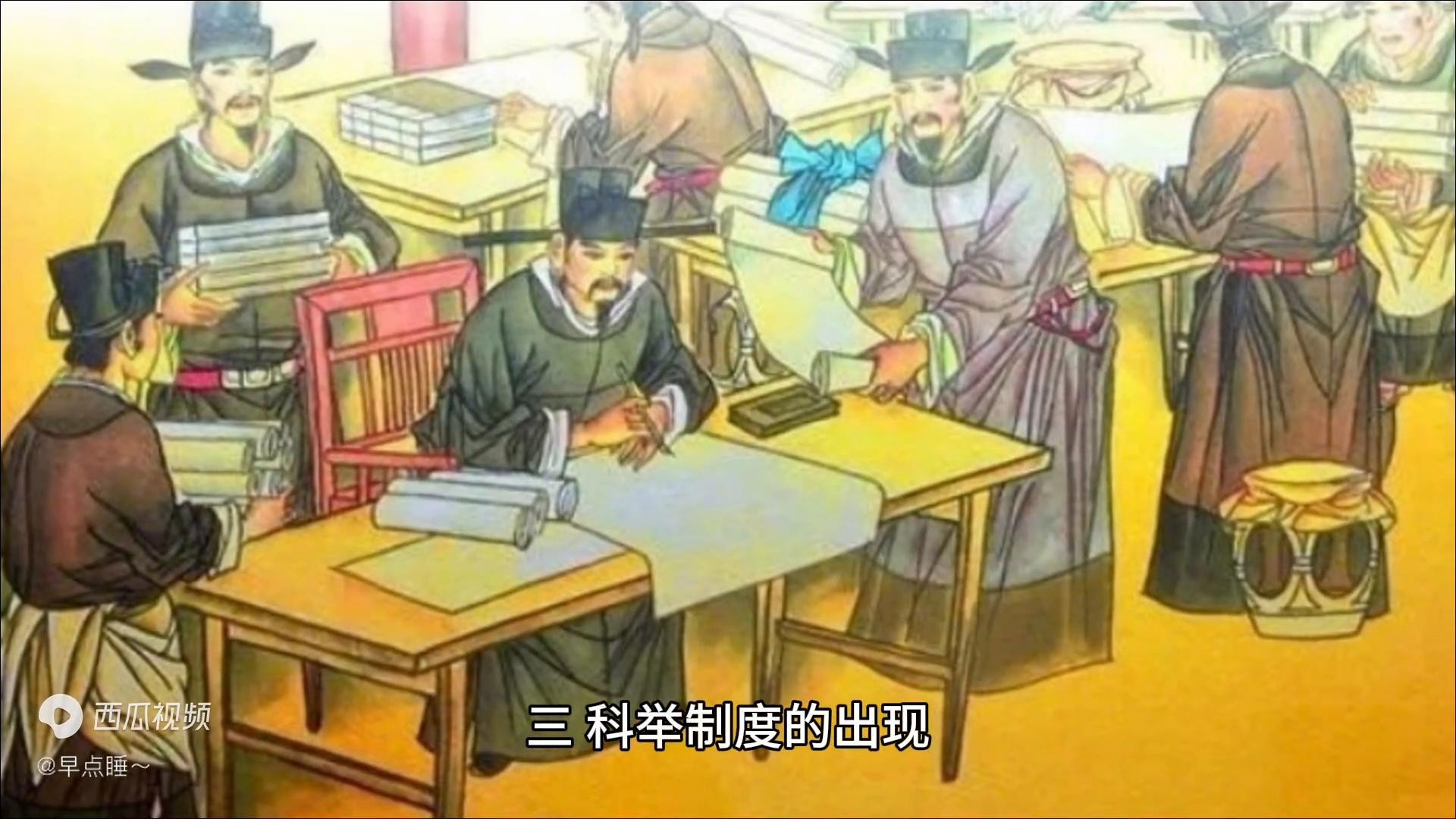 ·三、科举制度的出现。魏晋南北朝时期的九品中正制弊端颇多,不利于皇权以及人才的选拔。隋炀帝开创了科举制度,以才能取代血统成为选拔人才的衡量标准,为寒门子弟提供的晋升的通道,遏制了门阀世家对权利的垄断,加强了皇权。
