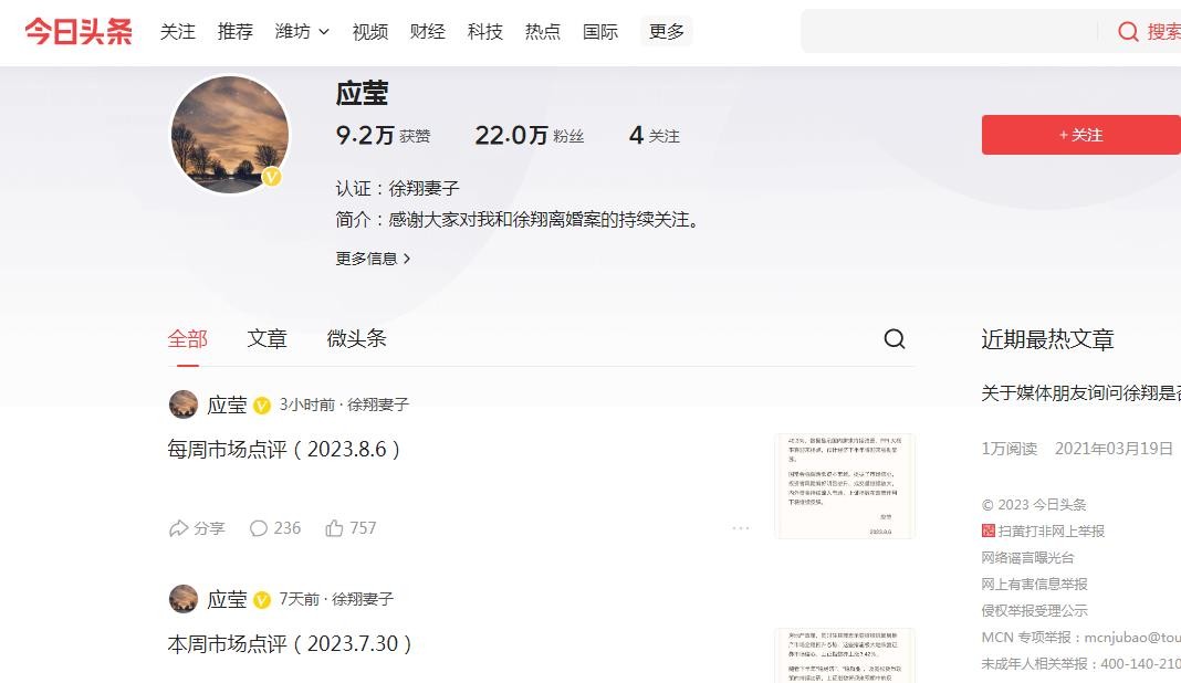 尽管应莹几年来一直在为与徐翔离婚打官司,然而她的微博、头条认证却始终是“徐翔妻子”。