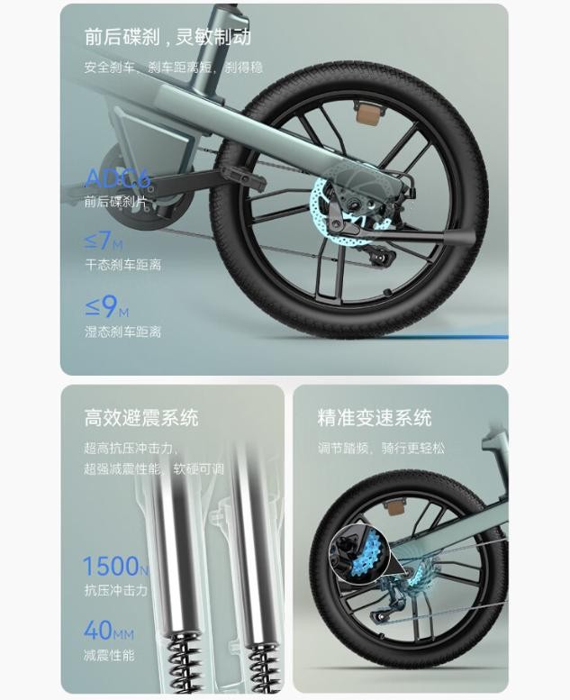 此外,喜德盛智能电助力自行车还采用了前后碟刹设计,前后碟刹片均为 ADC6,干态刹车距离≤7米、湿态刹车距离≤9米。同时该自行车的避震系统具有1500N抗压冲击力,40MM减震性能,支持软硬调整;使用精准变速系统,踏频可调,进一步提高骑行体验。