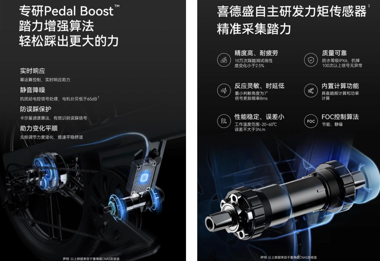 喜德盛智能电助力自行车采用了专研的Pedal Boost踏力增强算法,这一技术使得自行车能够实时响应骑行者的动作,提供精准的助力。同时,静音降噪技术让骑行更加安静,防误踩保护则有效避免了不必要的误操作。配合自主研发的高精度力矩传感器(具有耐疲劳、防水、抗摔等特点),内置踏频计算和功率计算功能,可实时反馈骑行数据。