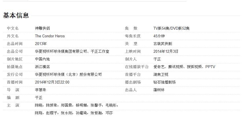 2014年内地版《神雕侠侣》改编自金庸同名小说。该剧由华夏视听环球传媒(北京)股份有限公司出品、李慧珠执导,于正编剧,陈晓、陈妍希、张馨予、杨明娜、毛晓彤、孙耀琦、郑国霖、赵韩樱子、秦岚等人主演。
