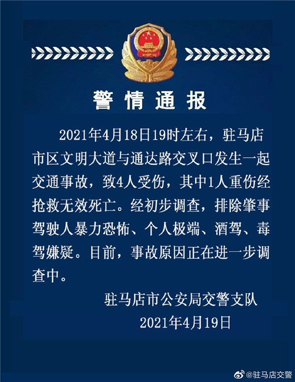 当日下午,驻马店交警发布警情通报,通报显示:警情通报:2021年4月18日19时左右,驻马店市区文明大道与通达路交叉口发生一起交通事故,致4人受伤,其中1人重伤经抢救无效死亡。经初步调查,排除肇事驾驶人暴力恐怖、个人极端、酒驾、毒驾嫌疑。目前,事故原因正在进一步调查中。
