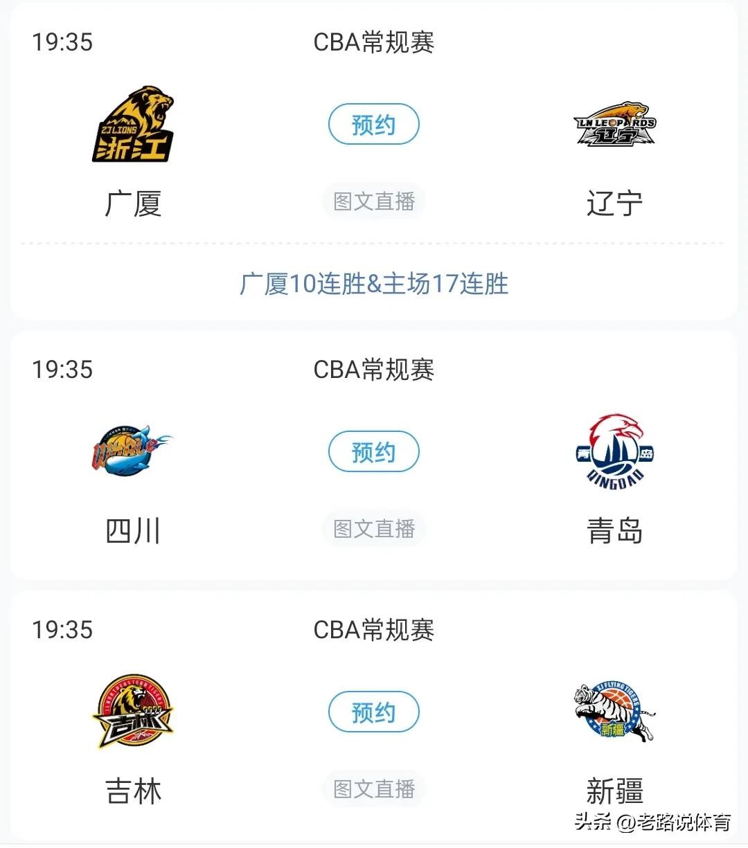 CCTV5体育频道最新节目单已经出炉,因为今天是周四,咪咕视频篮球独播日,所以今天的CBA常规赛将不会在央视5播出,今晚CBA常规赛依然有3场比赛,分别是热门夺冠球队浙江广厦主场迎战卫冕冠军辽宁本钢的巅峰对决,四川丰谷VS青岛国信制药,吉林九台农村商业银行VS新疆伊力特,3场比赛场场充满悬念与看点。