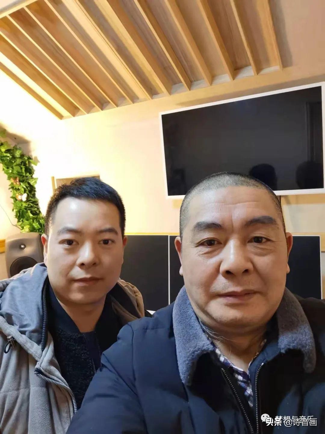 歌曲《回家》词曲作者2022年1月30日凌晨2点在录影棚留影纪念 左:曲作者洲洲、右:词作者王德清