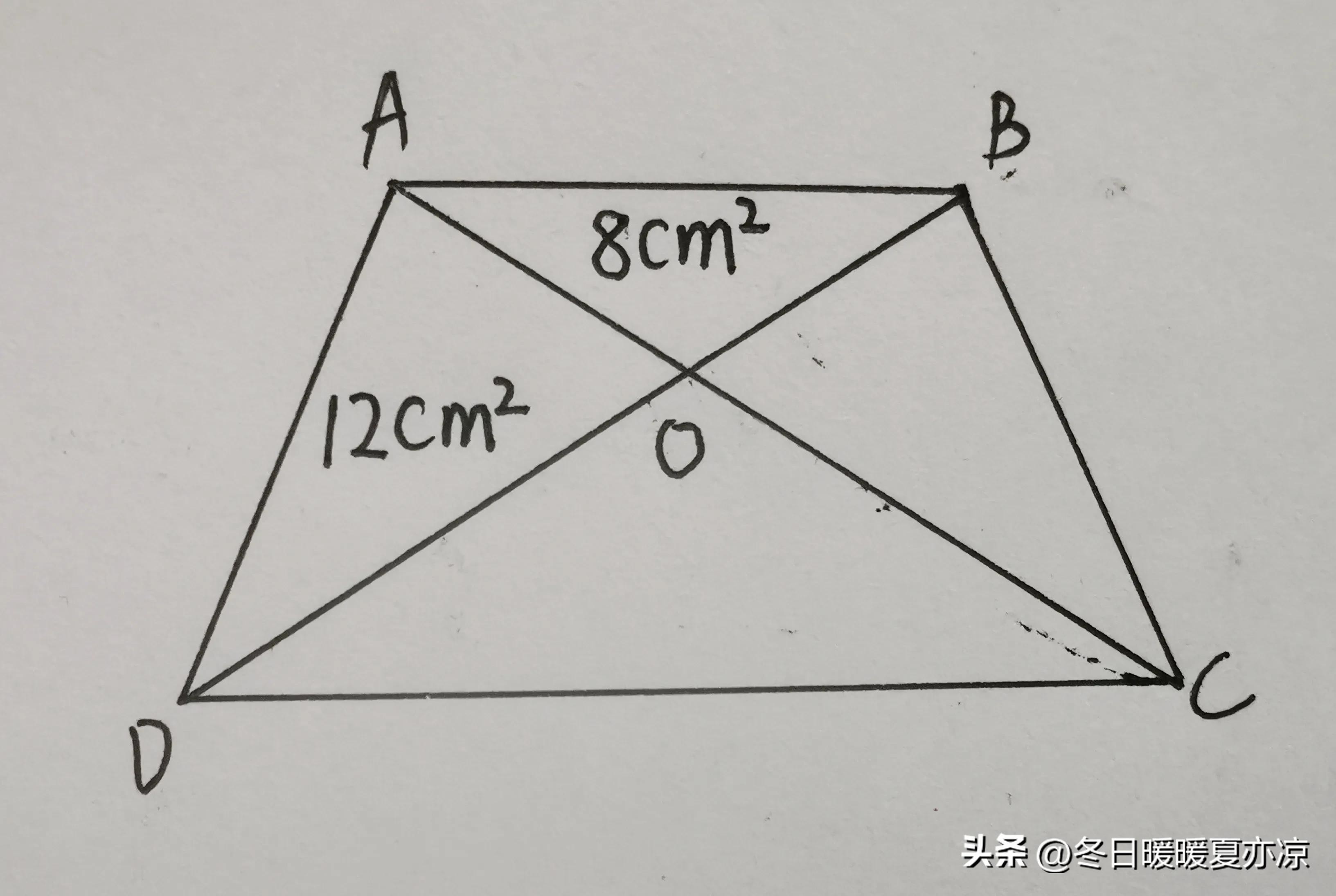 题目:如图所示,在梯形ABCD中,对角线BD,AC相交于点O,三角形AOB的面积是8平方厘米,三角形AOD的面积是12平方厘米,求梯形ABCD的面积是多少?