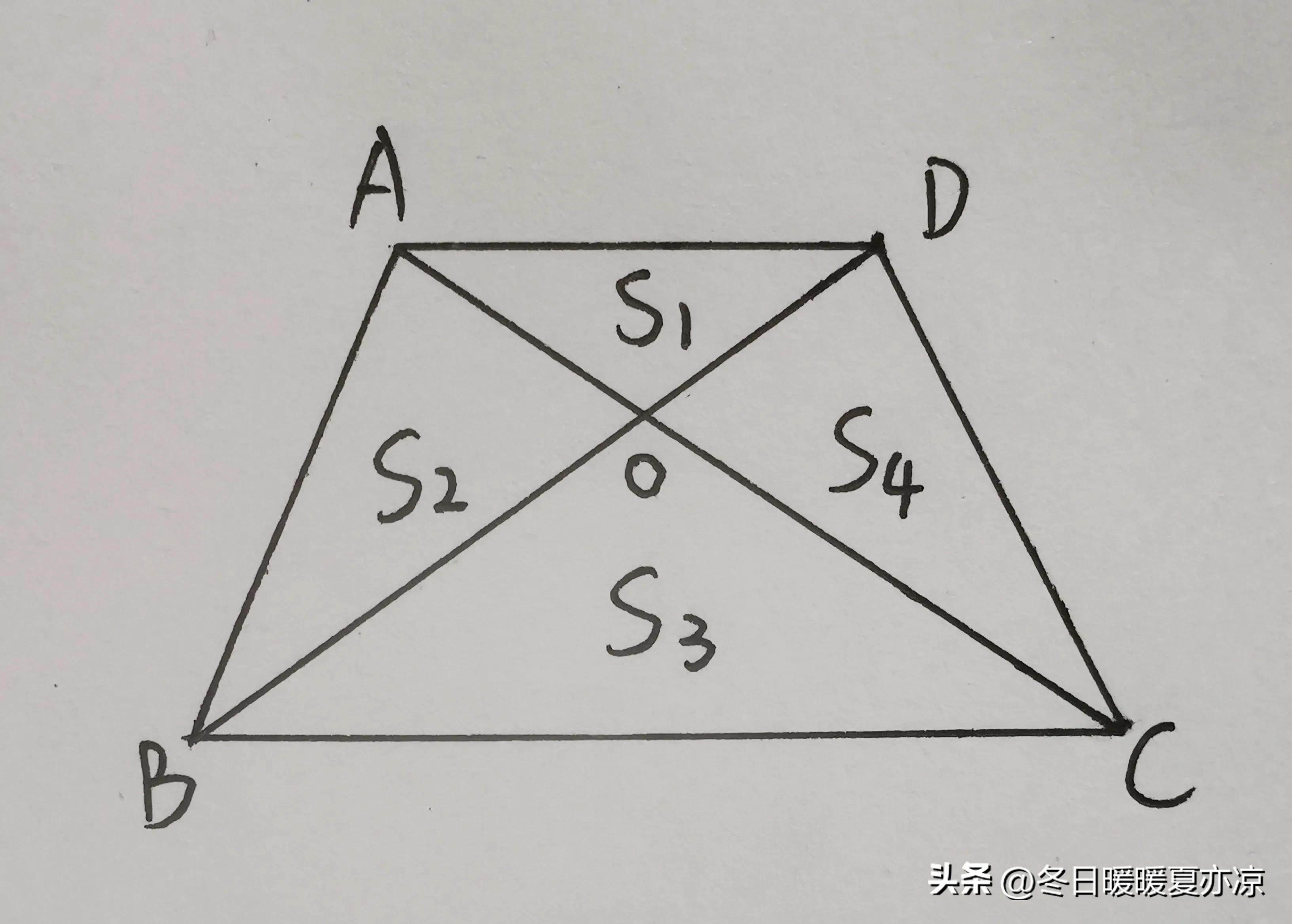如图所示,在梯形ABCD中,肯定还满足S1×S3=S2×S4,除此之外,还有S2=S4,其实这个也好推导,由这学期所学的等底等高的两个三角形面积相等,我们可以得到三角形ABC的面积等于三角形DBC的面积,从这两个三角形中同时去掉三角形BOC,所以就有三角形AOB的面积等于三角形DOC的面积。
