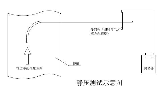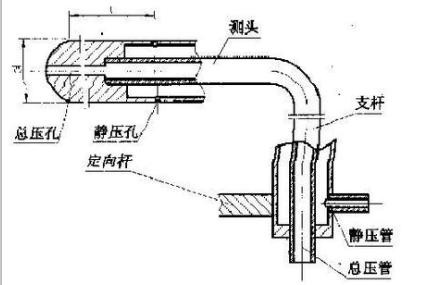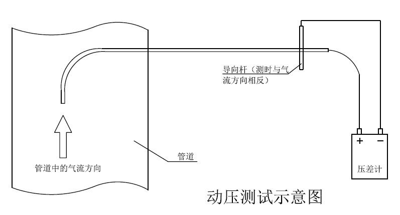 如上图所示,毕托管有两根不同直径的304不锈钢圆管子同心套接而成,管子内部直通尾端部的接口为全压测试口,外管侧端接口为静压测试口。定向杆与毕托管椭圆头部的方向一致,使用时可以调节测试方向,使毕托管头部始终平行于气流的方向(如下图所示)。