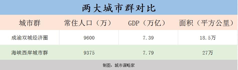 就目前来看,除了京津冀、长三角和粤港澳以外,中国第4极呼声最高的就是成渝双城经济圈了,但是今后,当国家正式批复海峡西岸城市群为国家级城市群后,谁是中国第4极还真不好说,如下图所示,两大城市群基本面。