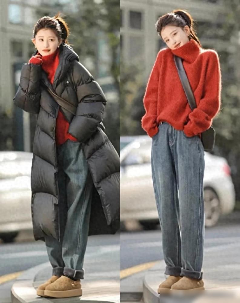 在搭配的时候,可以选择一件红色高领毛衣与一条复古蓝牛仔裤,外面在搭配一件羽绒服。