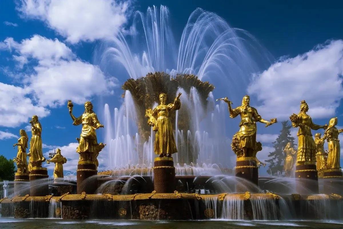 民族友谊喷泉(又名人民友谊喷泉、国民团结喷泉)位于莫斯科市中心的全俄展览中心主展厅后面。这座喷泉始建于1959年6月,被誉为全世界最昂贵的镀金喷泉。喷泉池边屹立着15名身穿各加盟共和国民族服装、手握鲜花和果蔬的美丽少女金色塑像,代表着前苏联15个加盟共和国各民族人民的友谊。在塑像的中间矗立着一个象征着丰收的巨大黄金麦穗,下面有葵花拥簇,寓意着和平、繁荣与团结。这座喷泉不仅是莫斯科的标志性建筑之一,也是苏联时期文化遗产的重要象征。