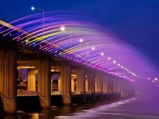 月光彩虹喷泉位于韩国首尔,被巧妙地设计在横跨汉江的盘浦大桥桥身两侧。这座喷泉拥有约1万个喷口,每分钟射出的水量接近190吨。为了增添夜间的视觉效果,设计者在每个喷口上都安置了LED照明灯,使喷泉在夜晚呈现出五彩斑斓的彩虹效果。这座喷泉不仅是首尔的一大亮点,也是韩国现代都市文化的重要象征。