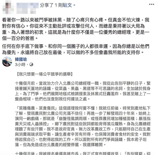 2018年台湾“九合一”选举期间,韩国瑜作为大热门的候选人物,其女儿韩冰开始被大家认识,韩冰为韩国瑜管理社交媒体账号,帮他创造了很大的网络声量,被网友称赞是“有颜有脑的正妹政二代”,韩国瑜也一度在网络上被称为“国民岳父”。