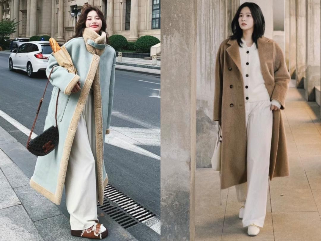 推荐穿搭3:羊绒大衣+白色绒裤