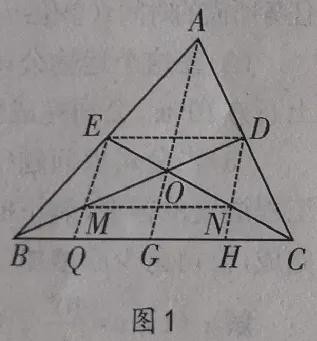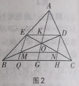 证法一:如图二,设BD,CE交于点O,连接ED,AO,并延长AO交BC于点G,交ED于点K。由于DE∥BC,并且BO=2OD,CO=2OE,根据平行线分线段成比例的定理可得: