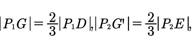 又设中线P₁D,P₂E上各有一点G,G',且