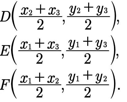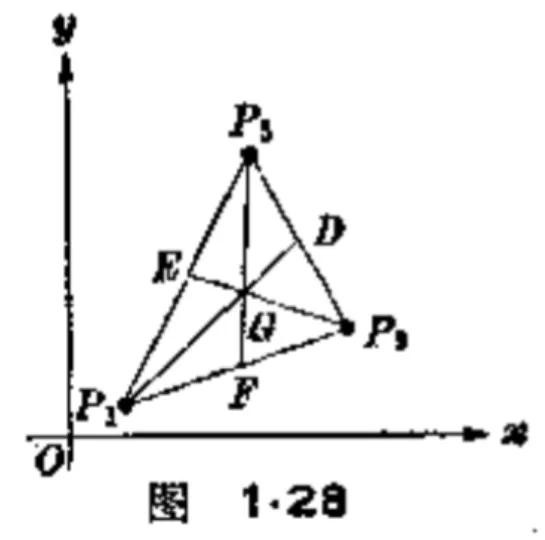设三角形的三个顶点为P₁(x₁,y₁),P₂(x₂,y₂),P₃(x₃,y₃),中线为P₁D,P₂E,P₃F。即D,E,F分别为各边的中点(如图1.28)它们的坐标是