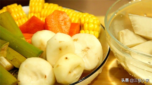 ③ 中间来出来一下配料:山药去皮切小块;马蹄削皮;青甘蔗砍小条;玉米切小圈;胡萝卜切滚刀块;南姜用刀背拍一拍;